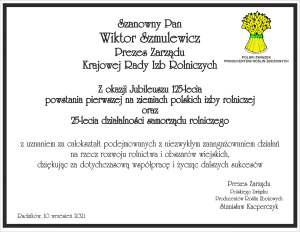 Z okazji Jubileuszu 125-lecia powstania pierwszej na ziemiach polskich izby rolniczej oraz 25-lecia działalności samorządu rolniczego, na ręce Pana Wiktora Szmulewicza, Prezesa Zarządu Krajowej Rady Izb Rolniczych, Stanisław Kacperczyk, Prezes Zarządu PZPRZ złożył stosowne gratulacje, podkreślając całokształt podejmowanych przez Izby Rolnicze z niezwykłym zaangażowaniem działań na rzecz rozwoju rolnictwa i obszarów wiejskich, dziękując za dotychczasową współpracę i życząc dalszych sukcesów.